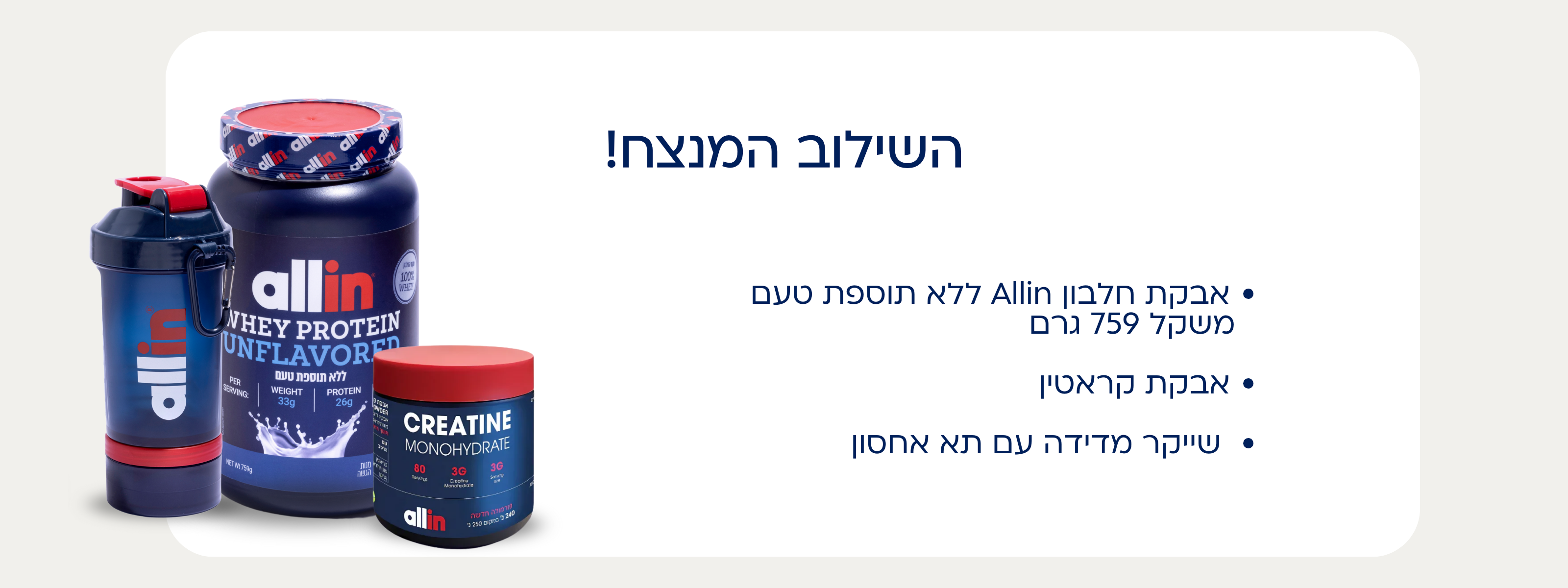 חבילת השילוב המנצח היא הדרך שלך לקחת את השגרה שלך שלב אחד קדימה – זהו סט יסוד שכל מתאמן\נת חייב\ת, כזה שישמש אותך יום־יום, ויבטיח שהגוף שלך מקבל בדיוק את מה שהוא צריך כדי לגדול, להתפתח ולהישאר באנרגיה גבוהה.